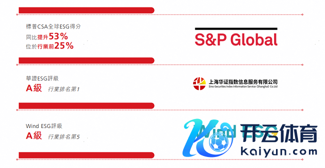 其业务进展及发展出息,亦赢得海外成本阛阓的高度认同。公司已获纳入MSCI中国袖珍股指数,恒生概括指数、恒生中袖珍股指数,以及富时中国小盘股指数等因素股。2024年标普民众ESG得分大幅栽种53%,进入行业前25%,并赢得华证指数、Wind等多家机构赐与的ESG“A”级评级。