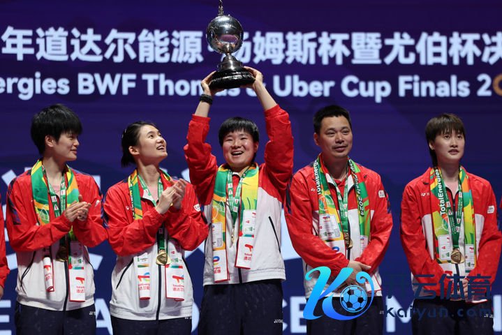 5月5日,中国队选手何冰娇(中)在受奖庆典上高举尤伯杯奖杯。新华社记者 陈斌 摄