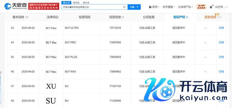 凭证天眼查认知,本年9月,济南某公司央求注册了“YU7”商标,何况海外分类为运载器具,刻下的商标气象认知为“恭候骨子审查”。何况,这个公司作念事还挺“周详”,“UU7”“EU7”“CU7”“ULTRA”“SU ULTRA”“SU7 PLUS”“SU7 PRO”“SU7 MAX”“苏九”这些商标完全被他们央求注册了。好家伙,看来这公司里有高手啊!把盯得死死的,只怕从雷总身上捞不着油水。