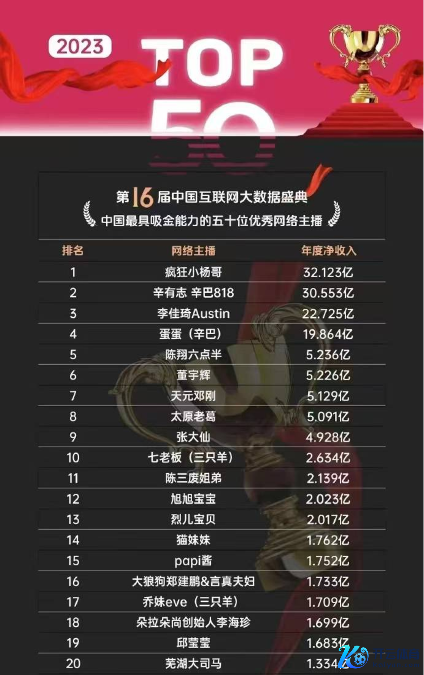 2023年榜单的前六位依旧是带货主播,只不外彼时的小杨哥风头正盛,一年狂赚32.123亿。排在第二的是辛有志,30.553亿;李佳琦第三,22.725亿;则排在了第六名,仅有5.226亿。