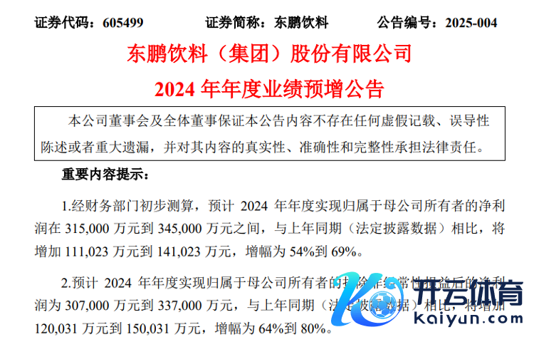 1月20日晚间,东鹏饮料发布了2024年度事迹预增公告。公告表露,东鹏饮料展望2024年度已毕归母净利润31.50亿元到34.50亿元,同比增长54%到69%,创下了上市以来最佳的事迹。商业收入方面,东鹏饮料展望叙述期内已毕商业收入157.2亿元到161亿元,同比增长40%到43%。