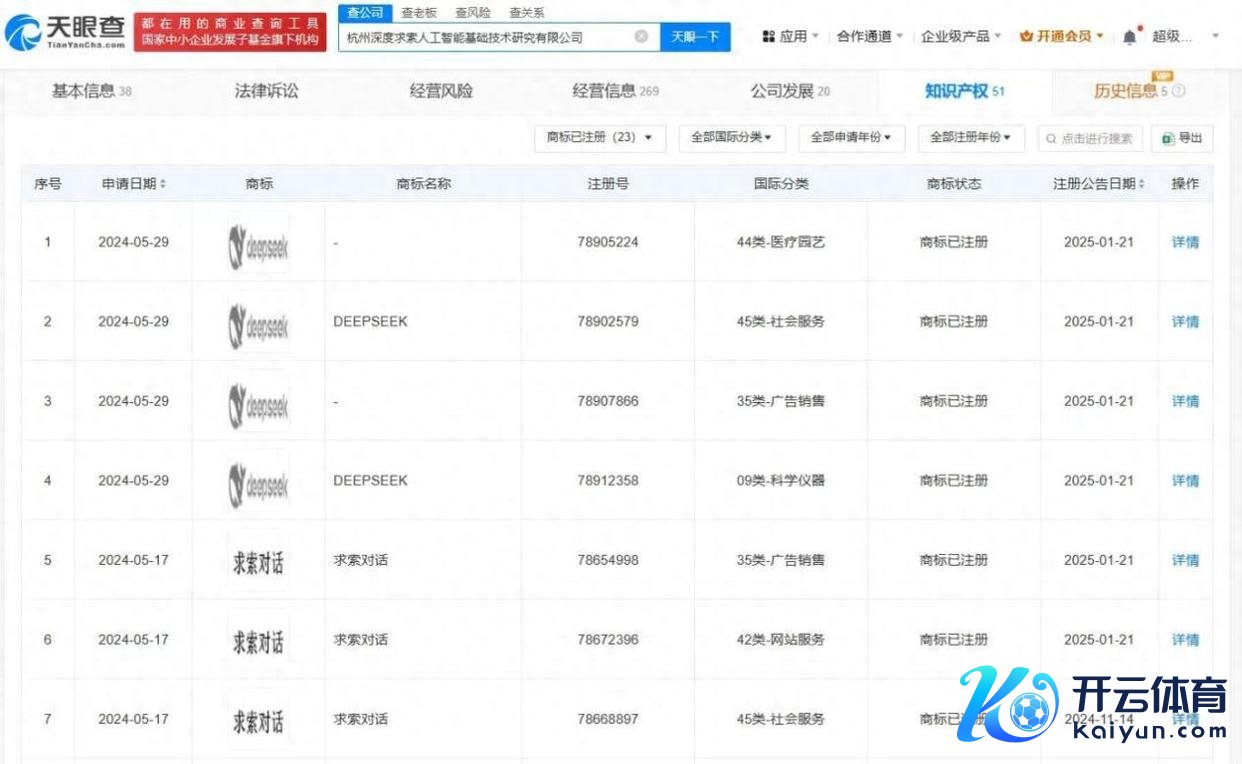 学问产权信息泄漏,该公司已告捷注册多枚“DEEPSEEK”“求索对话”“深度求索”商标,国外分类触及告白销售、科学仪器、西宾文娱等。此外,该公司全资抓股的北京深度求索东说念主工智能基础时间接洽有限公司,已于2024年12月获批登记“Deepseek对话软件系统”软件文章权体育游戏app平台,版块号为V1.0。