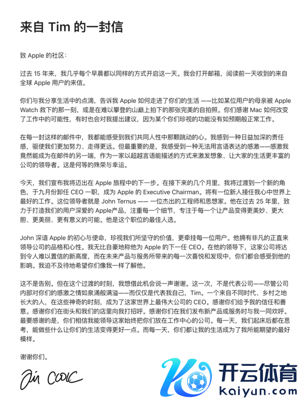 库克随后也发出了公开信。他写我方多年来简直每天黎明王人会读用户来信,写苹果若何奉陪东说念主们的活命,也写我方对Ternus的信任。那些句子背后,代表着一个把苹果带到4万亿好意思元体量的处置者,终于要把场所盘交给他东说念主。